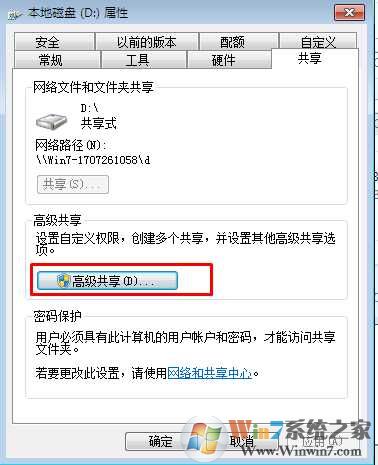 2、在共享選項(xiàng)下,點(diǎn)擊“高級(jí)共享”按鈕,如下圖: