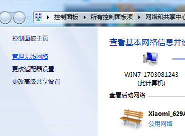 2、打開(kāi)“網(wǎng)絡(luò)和共享中心后”點(diǎn)擊左側(cè)面板的【管理無(wú)線網(wǎng)絡(luò)】;