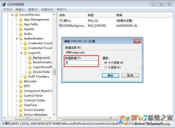 2、定位到:HKEY_LOCAL_MACHINE/SOFTWARE/Microsoft/Windows/CurrentVersion/Authentication/LogonUI/Background”,然后在右側(cè)找到“OEMBackground”的雙字節(jié)值,如果沒有就自己新建一個,然后將數(shù)值修改為1;