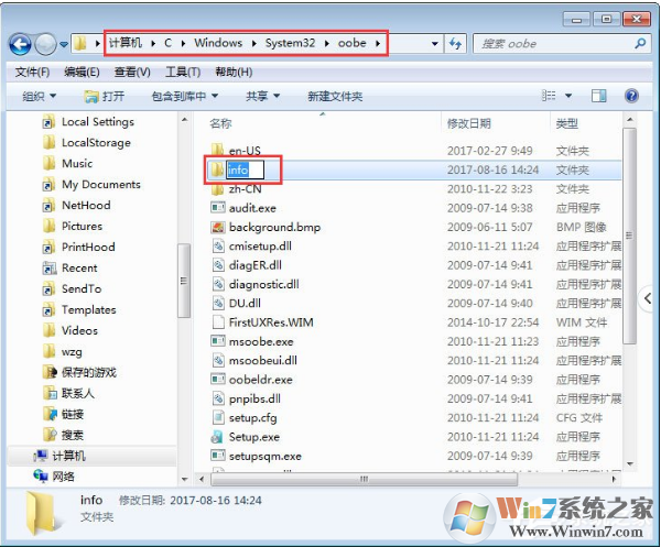 3、接著我們打開“C:\Windows\System32\oobe”目錄,創(chuàng)建一個名為“info”的文件夾;