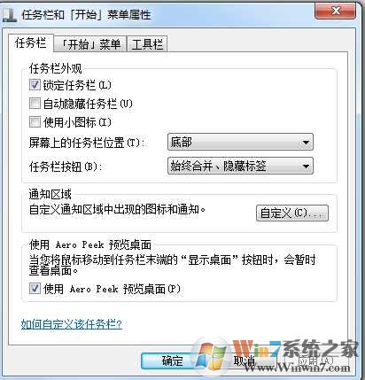 2、把“任務(wù)欄在屏幕上的位置”設(shè)置為“底部”,單擊“確定”退出或單擊“應(yīng)用”然后關(guān)閉窗口。