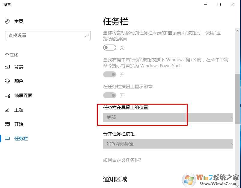 2、任務(wù)欄在屏幕上的位置,選擇為底部;