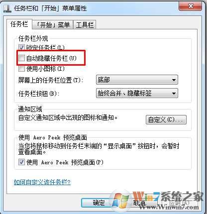 2、如果會,那么再右鍵點擊任務(wù)欄,在屬性中取消任務(wù)欄隱藏的設(shè)置。