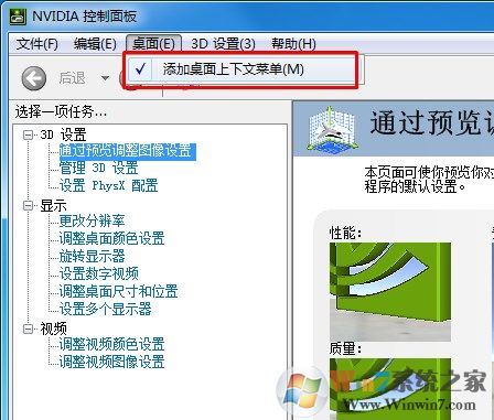 3、打開“NVIDIA控制面板”后在窗口的左上方點(diǎn)擊“桌面”然后把“添加桌面上下文菜單”勾選上。這樣以后就可以在桌面的空白處鼠標(biāo)右鍵就能找到。