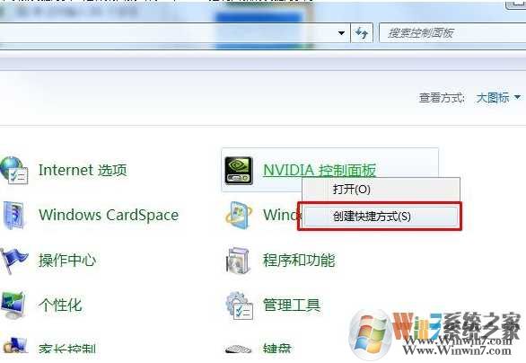 4、或者直接在控制面板處右鍵選擇添加快捷方式,這樣桌面就會(huì)有一個(gè)nvidia控制面板的快捷方式了