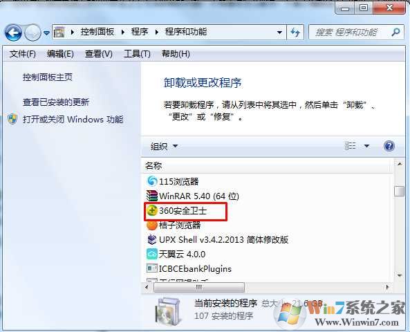 2、點擊卸載程序后,找到360安全衛(wèi)士,右鍵點擊卸載;