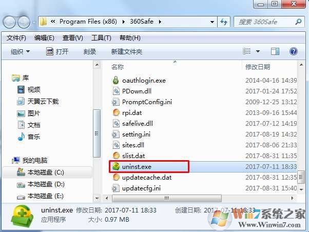 4、如果各位沒有在卸載程序里找到360安全衛(wèi)士,那么可以在C:\Program Files (x86)\360Safe目錄下找到uninst.exe