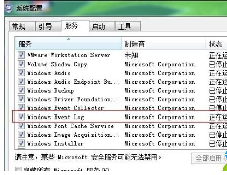 4、然后我們重新啟動(dòng)win7系統(tǒng),在開(kāi)始——運(yùn)行——msconfig——打開(kāi)系統(tǒng)配置里查看Windows Event Log 服務(wù)有沒(méi)有啟動(dòng),如果沒(méi)有啟動(dòng),記得手動(dòng)給該服務(wù)打上勾并確認(rèn)即可,當(dāng)然打開(kāi)services.msc 也可以進(jìn)行手動(dòng)啟動(dòng)Windows Event Log服務(wù),還可以設(shè)置啟動(dòng)方式為自動(dòng)。