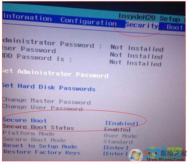 按鍵盤上下左右鍵選擇各個(gè)導(dǎo)航夾,一般在“Security”導(dǎo)航夾內(nèi)可以找到SecureBoot選項(xiàng),如下圖所示。
