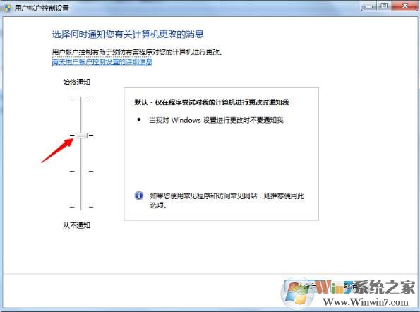 4、紅色箭頭指著用戶賬戶控制級別,越高越嚴(yán)格,可以拉到最底,然后確定,它就不會在出提示了。