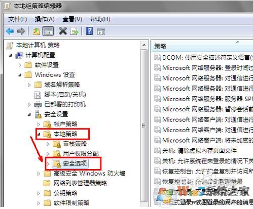 2、打開組策略之后,依次展開 計算機(jī)配置—Windows設(shè)置——安全設(shè)置——本地策略——安全選項;