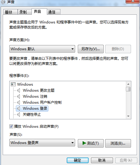 2、最上面菜單欄選擇聲音、你會發(fā)現(xiàn)系統(tǒng)最下方的聲音選項時沒有顯示的,這是我們就可以選擇程序事件中的windows登陸