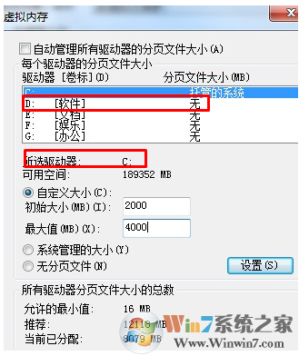 6,、注意了,這里一定要將位置選擇在非系統(tǒng)盤,除了c哪個盤都可以,然后在自定義大小里設置自己想要的大小,建議一般是自己內(nèi)存的1.5倍到2倍,如果你的內(nèi)存是2048MB(1GB等于1024mb),那么你可以設置到4096mb,這是合理的最大值Win7系統(tǒng)之家 m.cncxm.com