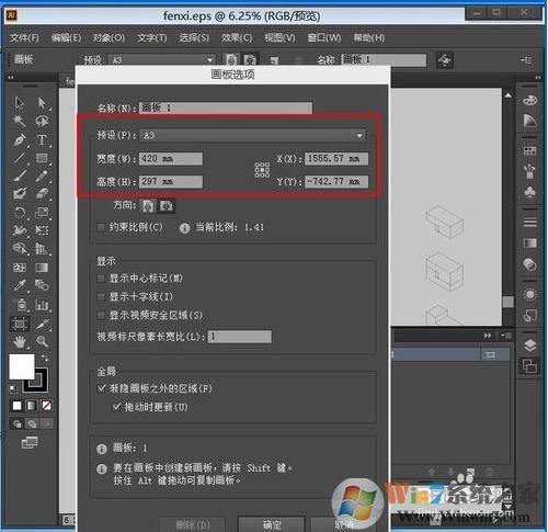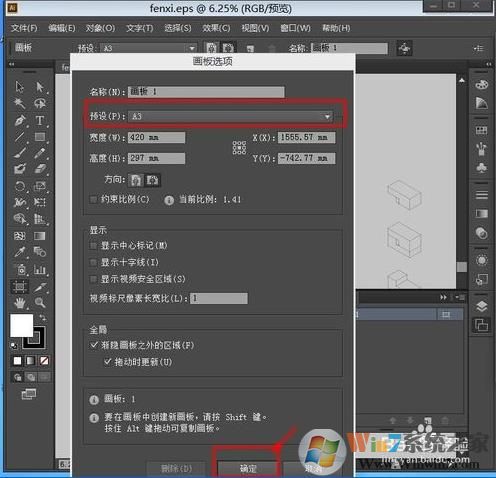 2.點擊箭頭所指處,設置畫板大小,點擊確定,把預設設置A3篇幅;