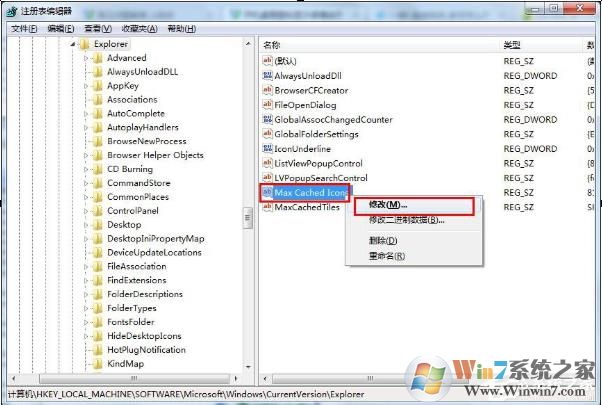 3、選中“Max Cached Icons”項,單擊鼠標右鍵,選擇“修改”選項,打開編輯字符串窗口,如下圖所示: