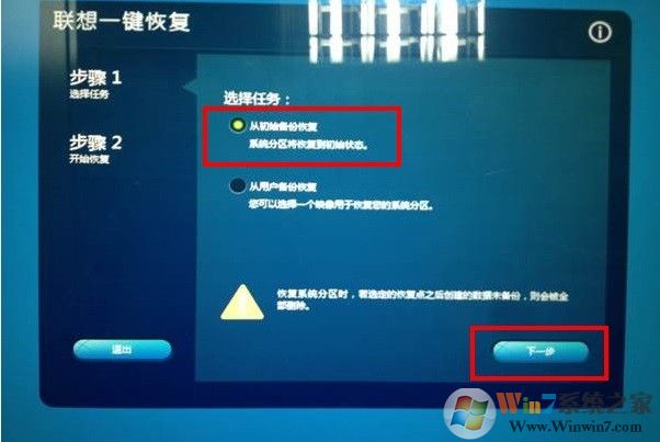 通過上下箭頭選擇“system recovery”,回車后進(jìn)入一鍵恢復(fù)頁(yè)面,默認(rèn)選擇從初始備份恢復(fù),直接點(diǎn)擊“下一步”