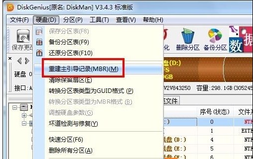 3、點(diǎn)擊diskgenius菜單欄 硬盤——重建主引導(dǎo)記錄