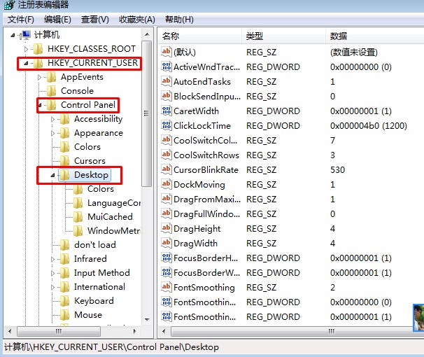 2、在打開的注冊表編輯器中依次展開注冊表項(xiàng)“HKEY_CURRENT_USER\Control Panel\Desktop”