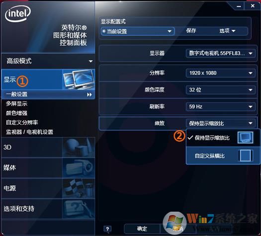 進(jìn)入高級模式后,在左側(cè)的“顯示”選項卡中選擇“一般顯示設(shè)置”。在右側(cè)“縮放”的下拉菜單中,勾選“自定義縱橫比”,進(jìn)入下一步設(shè)置。