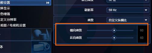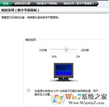 進(jìn)入“縮放選項”以后,可通過調(diào)節(jié)欠掃描與過掃描之間的滑塊,就能解決顯示不全的問題。