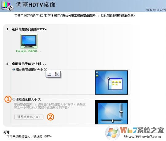 ①打開”調(diào)整HDTV桌面“界面選擇”調(diào)整桌面的大小“選項,激活”調(diào)整桌面大小“按鈕。②點(diǎn)擊”調(diào)整桌面大小“進(jìn)入調(diào)整界面。