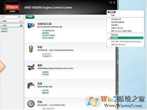 在桌面上單擊鼠標(biāo)右鍵選擇”顯示卡屬性“,進(jìn)入ADM顯卡控制臺。單擊在右上角”自選項“,在下拉菜單中勾選“標(biāo)準(zhǔn)視圖”。