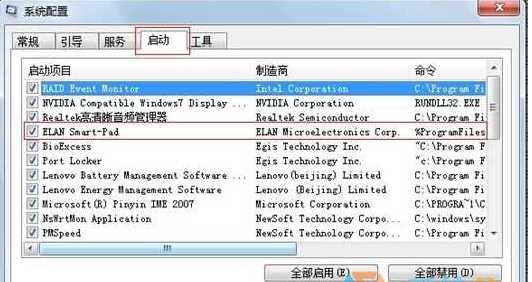 2、在“啟動”選項卡中,找到“啟動項目”為“ELAN Smart-Pad”把復選框中的對勾去掉。關閉ETD的開機啟動。