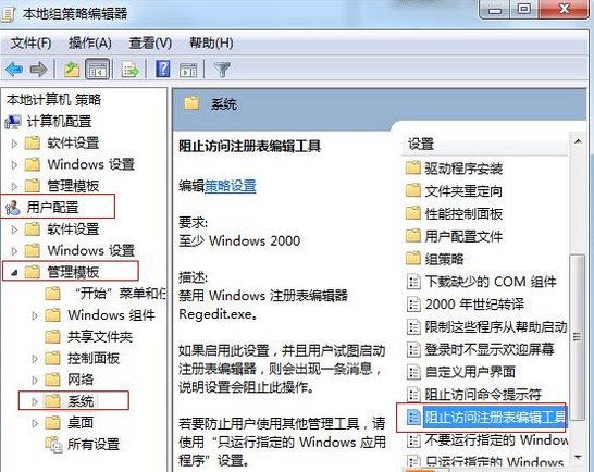 3、這時(shí)候我們可以在右側(cè)窗口中找到【阻止訪問(wèn)注冊(cè)表編輯工具】項(xiàng);