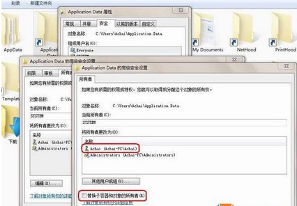 3、在彈出的所有者設(shè)置框中選擇帳戶“Achai”如果你是administrator登錄,就選擇相應(yīng)的帳戶,然后在“替換子容器和對象的所有者”的前面打勾,點(diǎn)擊“應(yīng)用、確定”。