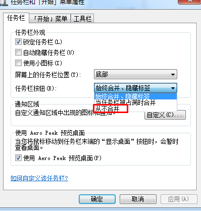 2、小編都沒有什么可說的了,因?yàn)樘?jiǎn)單了,看看下面的圖,我們把“任務(wù)欄按鈕”設(shè)置項(xiàng)選擇為“從不合并”就可以了;不過小編還是建議選擇當(dāng)任務(wù)欄被占滿時(shí)合并,這樣不會(huì)太雜亂,不過看自己喜好吧