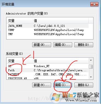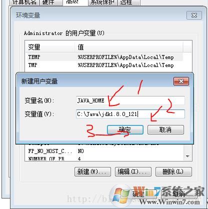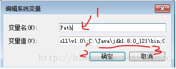 在原有變量值后面添加“;”號(分隔符,如2橫線所示),然后再輸入C:\Java\jdk1.8.0_121\bin;C:\Java\jdk1.8.0_121\jre\bin