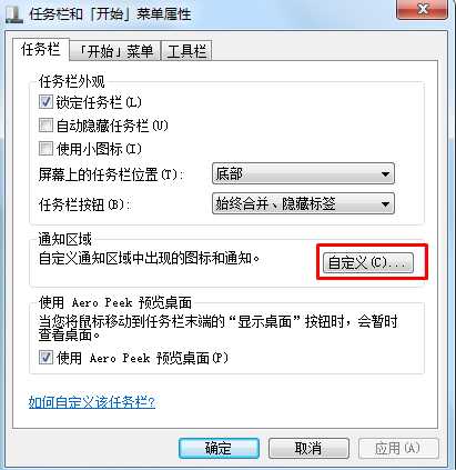 1、右擊任務欄選擇屬性,然后點擊“通知區(qū)域”的“自定義”按鈕;