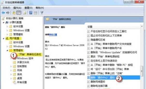 4、那么我們還需要在策略組中進行設置,點擊開始菜單,然后在搜索框中輸入“gpedit.msc”回車,打開本地策略組后,然后依次展開【用戶配置】-【管理模板】-【開始菜單和任務欄】,雙擊右側(cè)窗口中的“刪除“操作中心”圖標”,將該項置設為“已禁用”或“未配置”。