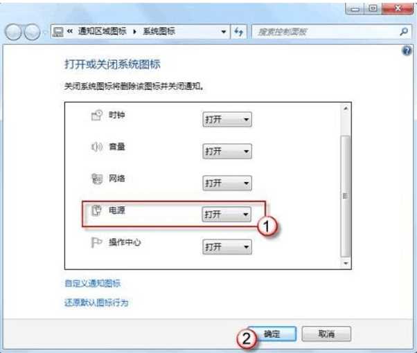3、在系統(tǒng)圖標設置界面,我們找到“電源”設置為“打開”,然后確定保存即可,不過有些用戶打開后電源圖標打開設置是灰色的無法設置,如下圖:
