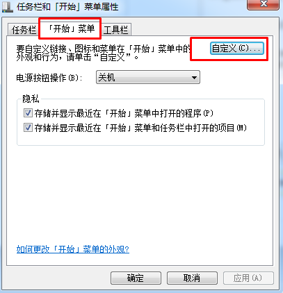 2、在屬性窗口,我們還需要點(diǎn)擊【「開始」菜單】標(biāo)簽,并按“自定義”按鈕;