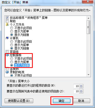 3、在自定義開始菜單選項(xiàng)列表中,找到“控制面板”,將不顯示此項(xiàng)目更改為“顯示為鏈接”然后應(yīng)用,就可以還原win7開始菜單中的控制面板選項(xiàng)了,其中還有一項(xiàng)是“顯示為菜單”選取該項(xiàng)后我們選中控制面板則會(huì)顯示控制面板里的項(xiàng)目列表