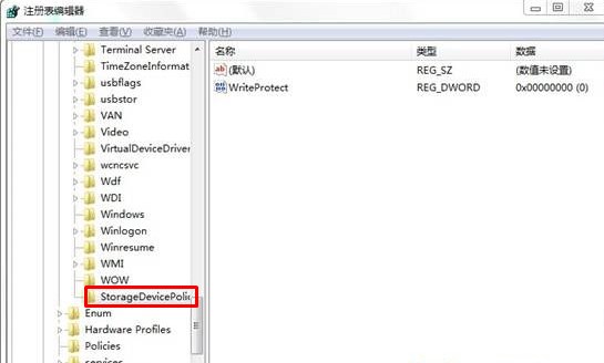 2、輸入命令回車后,在注冊(cè)表左右列表中依次展開(kāi)HKEY_LOCAL_MACHINE\SYSTEM\CurrentControlSet\Control\StorageDevicePolicies 如下圖所示