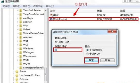 3、然后在右側(cè)項(xiàng)目列表中找到“WriteProtect”Dword值,雙擊該項(xiàng),將其中的數(shù)值更換為“0”,然后退出注冊(cè)表。
