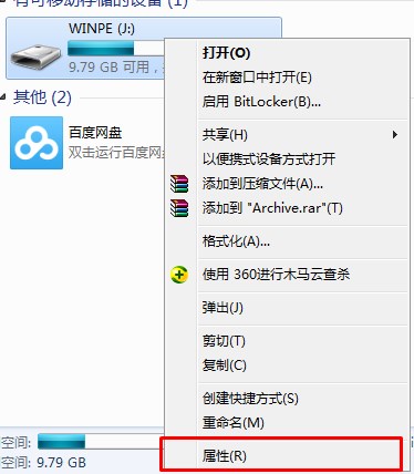 1、打開(kāi)計(jì)算機(jī),右鍵點(diǎn)擊U盤圖標(biāo),并選擇屬性;