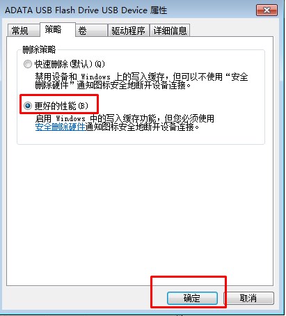 3、在”策略“選項(xiàng)卡中,我們對(duì)刪除策略進(jìn)行設(shè)置,選擇為”更好的性能“,然后然定保存設(shè)置。