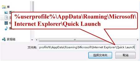 2、在新建窗口中的“文件夾”后面框中輸入“%userprofile%\AppData\Roaming\Microsoft\Internet Explorer\Quick Launch”,然后按下回車鍵;