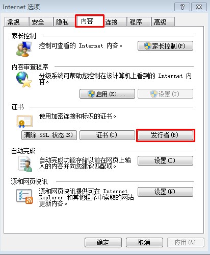 2、在Internet選項窗口中,點擊“內(nèi)容”標(biāo)簽切換到內(nèi)容頁,在證書區(qū)域點擊“發(fā)行者”按扭,如下圖所示:
