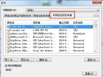 3、接著在證書窗口中,切換到“未受信任的發(fā)布者”列表,找到“Adobe Systerms Incoperated”項,將該項刪除即可。