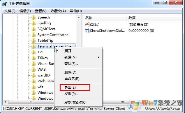 3、定位到:HKEY_CURRENT_USER\Software\Microsoft\Terminal Server Client\ 右鍵點(diǎn)擊然后選擇導(dǎo)出;