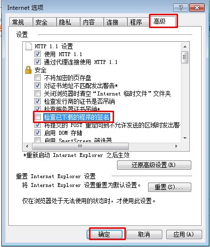 3、在高級設(shè)置列表中的“安全設(shè)置區(qū)域”找到”檢查下的程序簽名“選項,將該選項取消勾選;