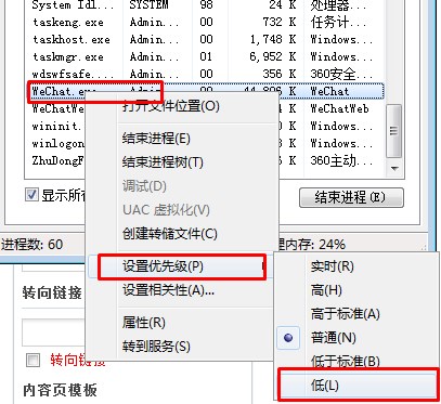 右鍵點(diǎn)擊微信主程序的進(jìn)程,在彈出的菜單中選擇“設(shè)置憂先級(jí)”,將不重要的程序設(shè)置為較低的優(yōu)先級(jí)別,如低于標(biāo)準(zhǔn)或低。如下圖: