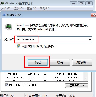 5.在創(chuàng)建新任務窗口中輸入“explorer.exe”,點擊“確定”即可。