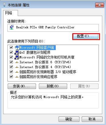4、在本地連接屬性界面,點(diǎn)擊“配置”按鈕;