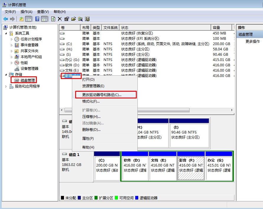 3、選擇U盤,這里我們就以F盤為例子,右鍵點(diǎn)擊,選擇“更改驅(qū)動器號和路徑