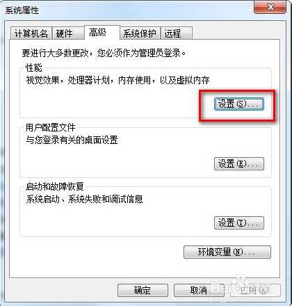 3、彈出“系統(tǒng)屬性”對話框,在“性能”欄上點“設置”;